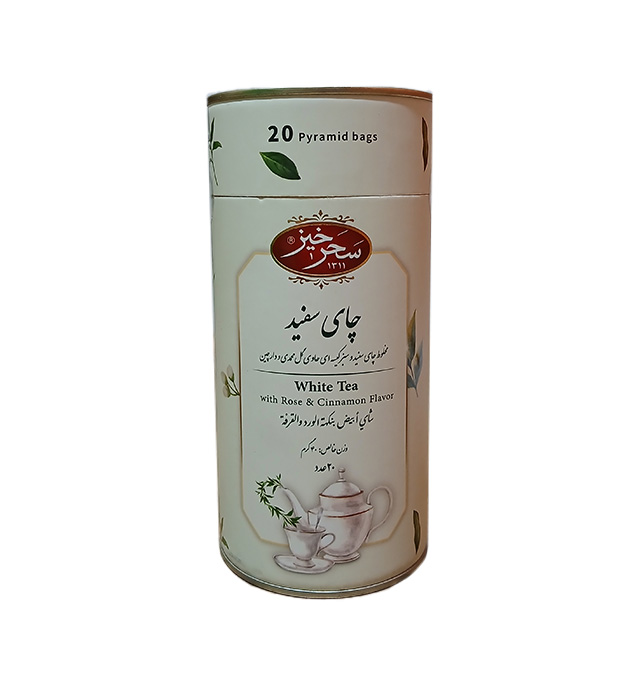 - مخلوط چای سفید و سبز کیسه ای حاوی گل محمدی و دارچین